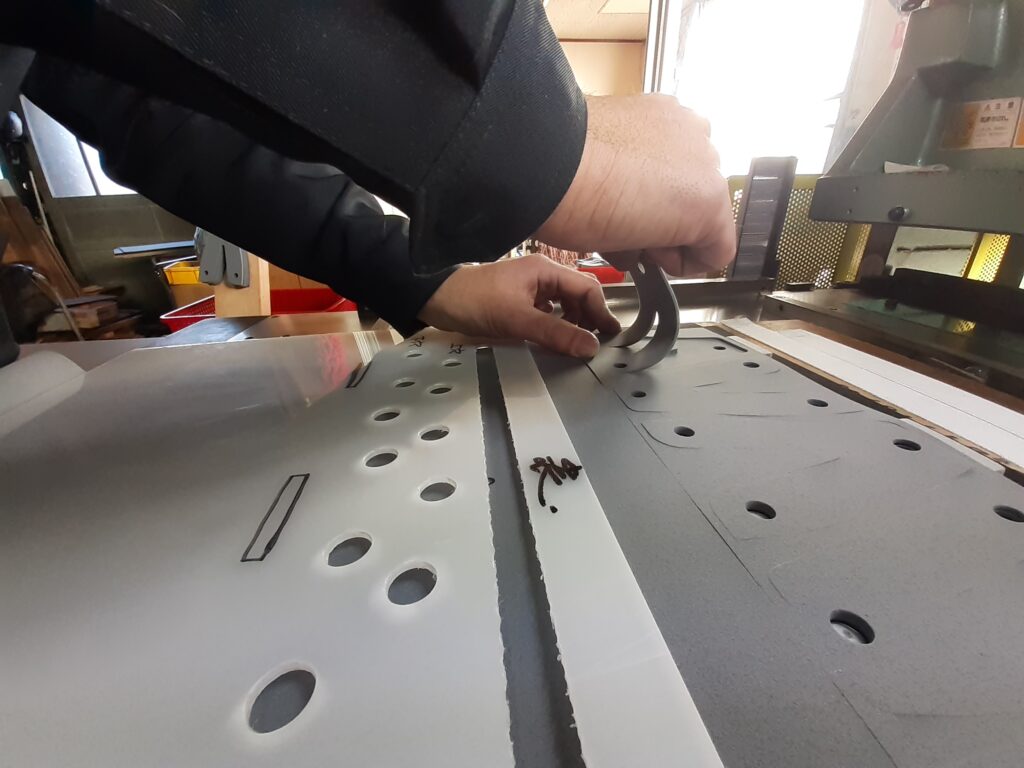 樹脂シートをプレス機により打ち抜く加工を行っています。